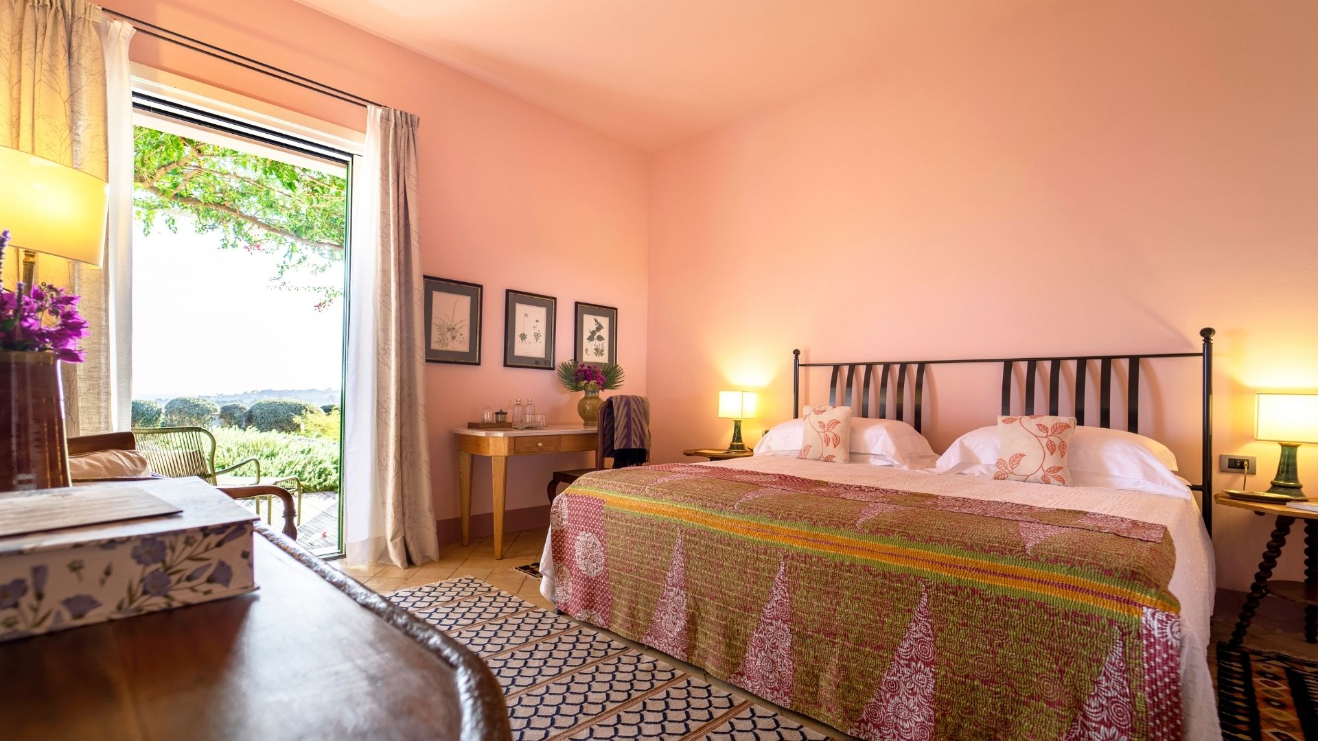 Quiet, elegant, with attention to detail. The Santolina room has a private terrace overlooking the panoramic green hillside that surrounds and overlooks our vineyards and the blue sea of Menfi.